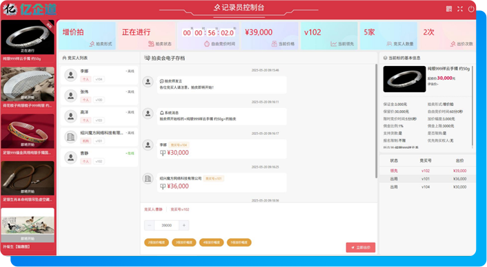 拍賣師可在拍賣控制臺(tái)主持競(jìng)拍,拍賣師發(fā)言、暫停/開(kāi)始、出價(jià)回滾、流拍、撤拍等!